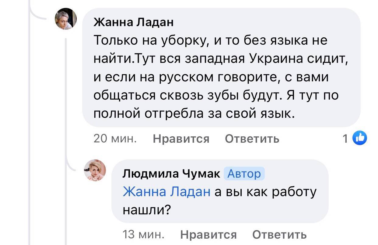 "Есть вакансии в основном на уборку, и то без языка не найти. Тут вся Западная Украина сидит, и если на русском говорите, с вами общаться будут сквозь зубы. Я тут по полной отгребла за свой язык", - делится в Facebook украинка Жанна Ладан.