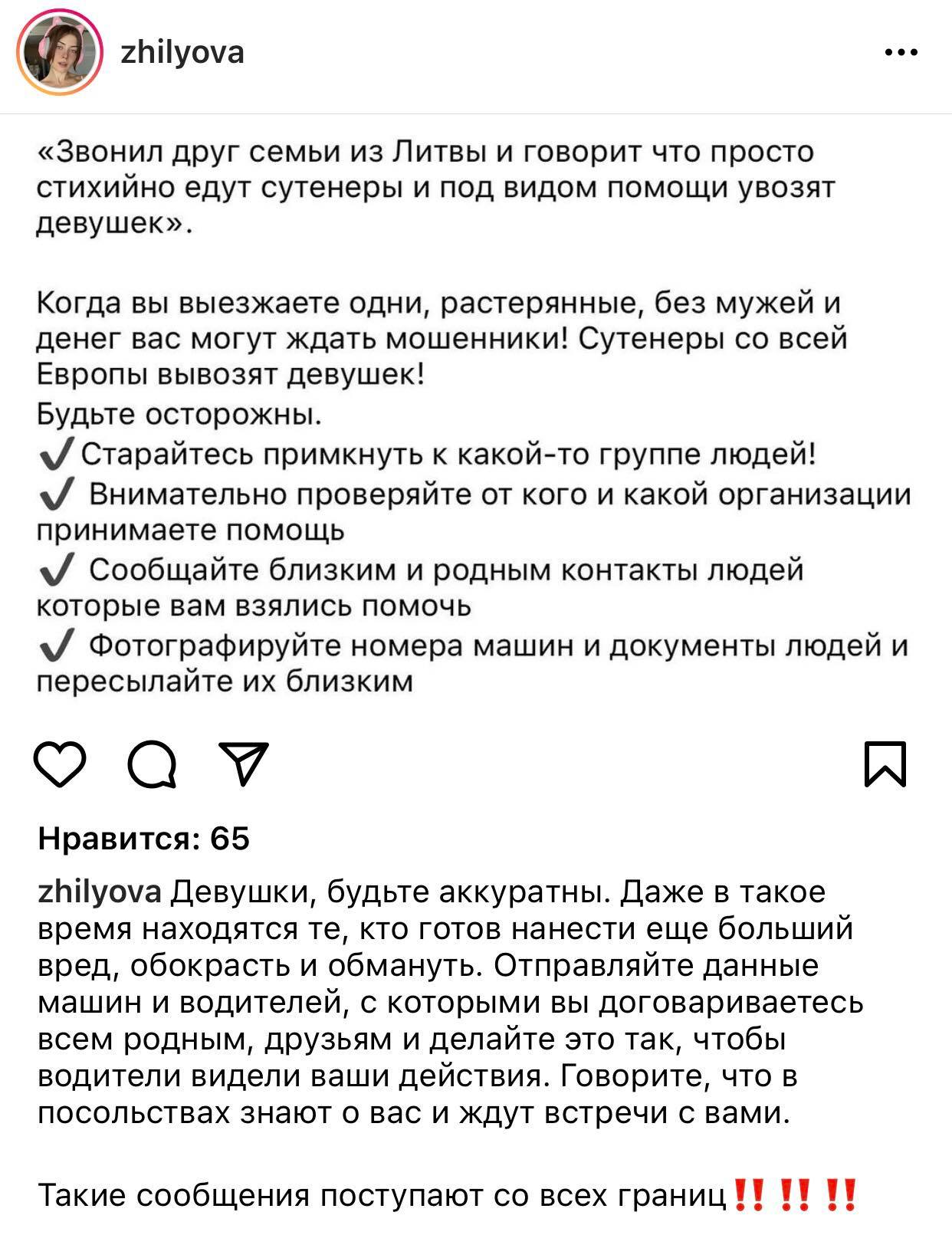 "Девушки, будьте аккуратны. Даже в такое время находятся те, кто готов нанести еще больший вред, обокрасть и обмануть. Отправляйте данные машин и водителей, с которыми вы договариваетесь всем родным, друзьям и делайте это так, чтобы водители видели ваши действия. Говорите, что в посольствах знают о вас и ждут встречи с вами", - пишет Жилева.