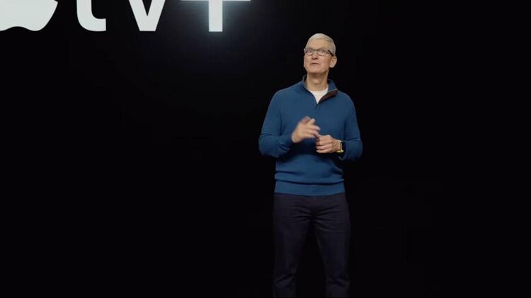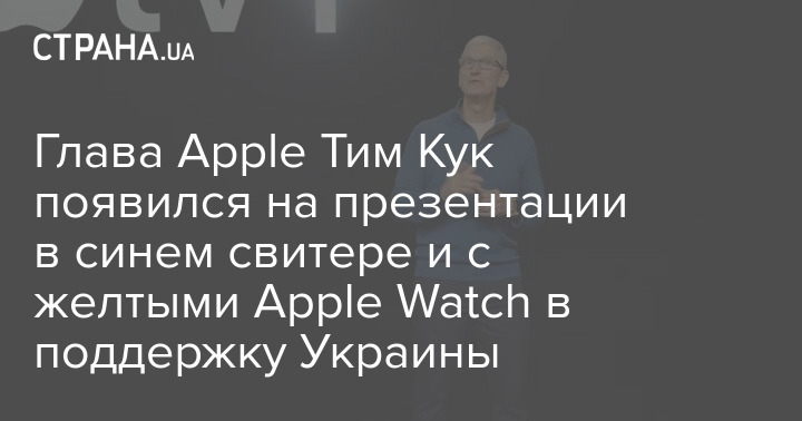 Глава Apple Тим Кук в знак поддержки Украины выступил на презентации в синем свитере и с желтыми Apple Watch на руке.