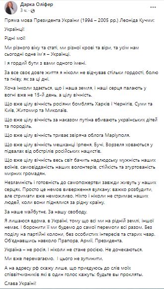 Заявление распространила пресс-секретарь Кучмы Дарка Олифер.