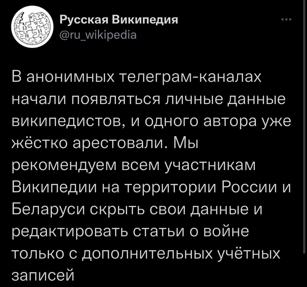 "Мы рекомендуем всем участникам Википедии на территории России и Беларуси скрыть свои данные и редактировать статьи о войне только с дополнительных учётных записей", — пишет аккаунт Русской Википедии.
