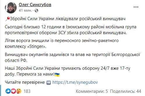 20.12 Харьковский губернатор заявляет, что ВСУ сбили Стингером российский истребитель под Изюмом. При этом заявляется, что он упал на территорию Белгородской области.