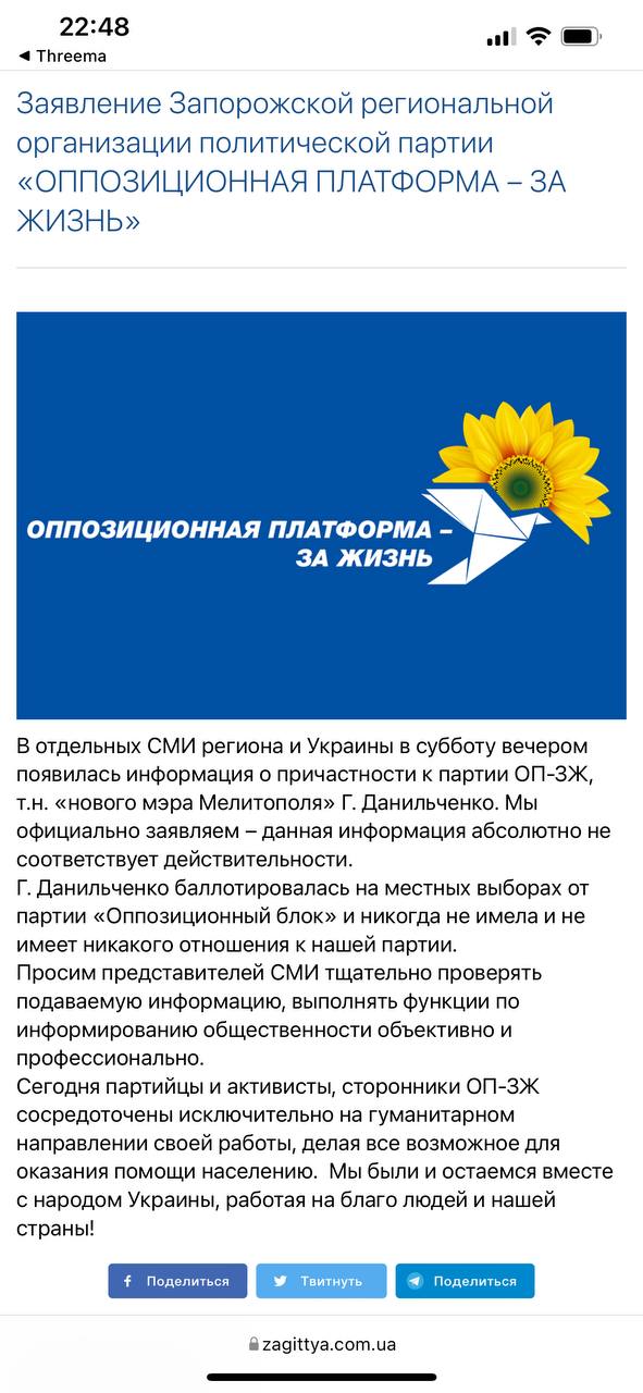 "В отдельных СМИ региона и Украины в субботу вечером появилась информация о причастности к партии ОПЗЖ, т.н. "нового мэра Мелитополя" Данильченко. Мы официально заявляем – данная информация абсолютно не соответствует действительности. Данильченко баллотировалась на местных выборах от партии "Оппозиционный блок» и никогда не имела и не имеет никакого отношения к нашей партии", - заявляют в ОПЗЖ.