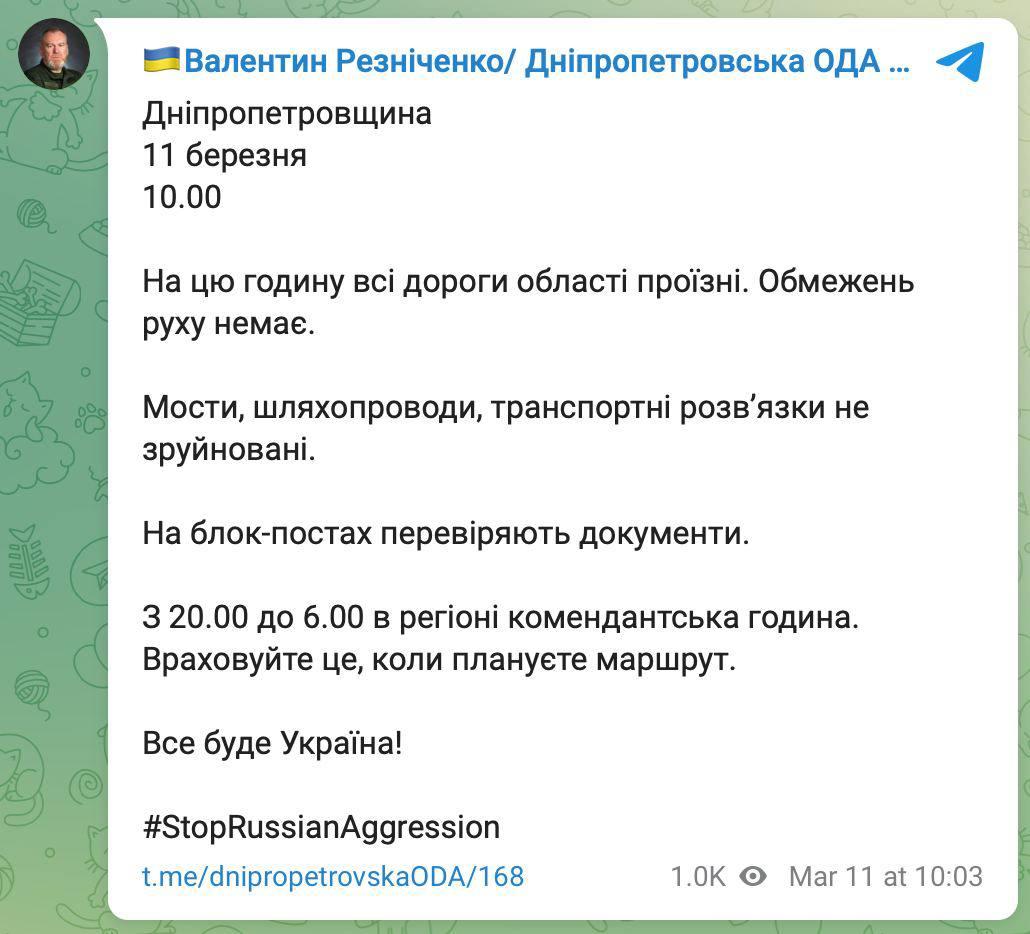 10.10 Ситуация на дорогах Днепропетровской области. Препятствий по движению и взорванных мостов нет. Но действует комендантский час с 8 вечера и до 6 утра.