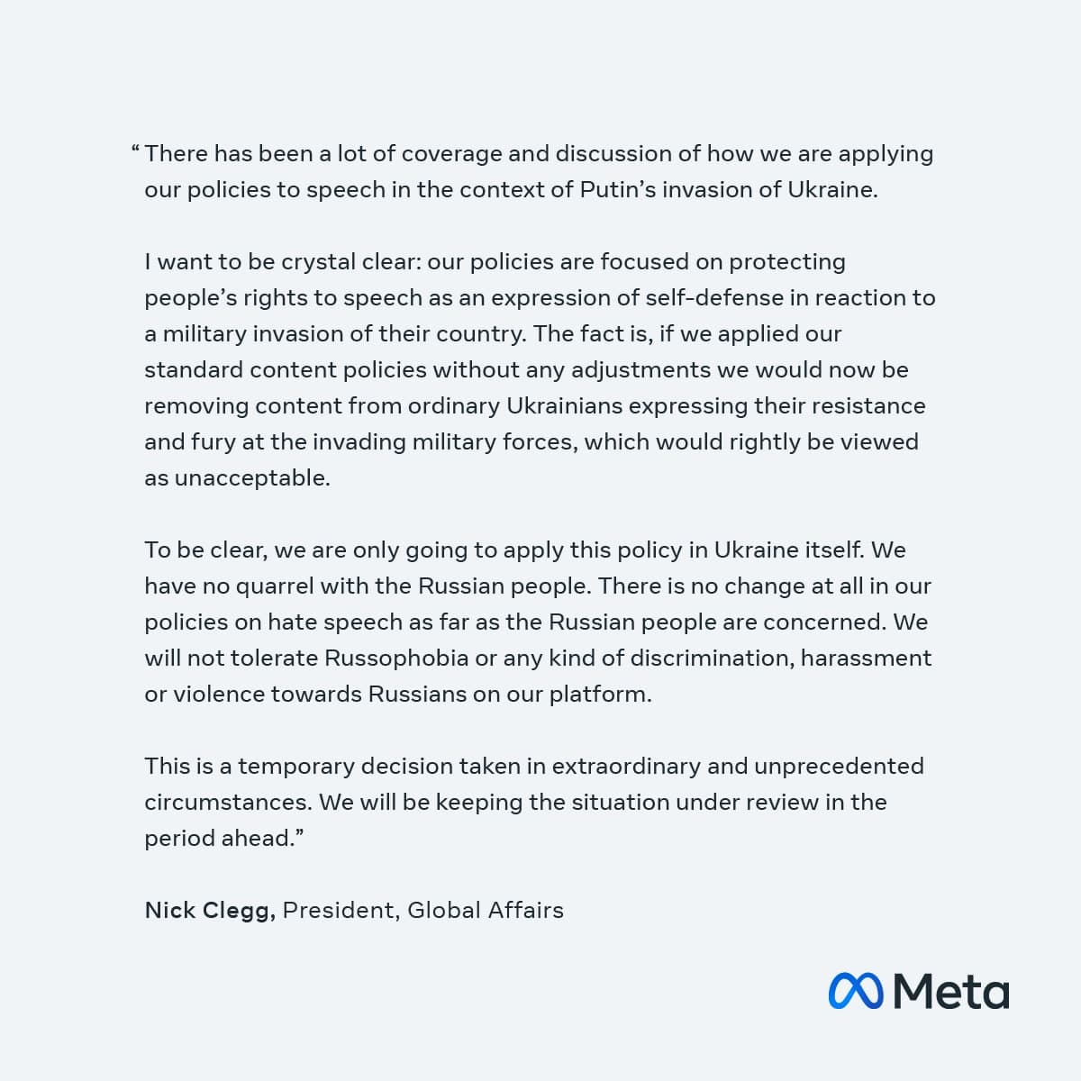 По его словам Meta "не потерпит русофобии или какой-либо дискриминации, запугиваний или призывов к насилию в отношении русских на нашей платформе".