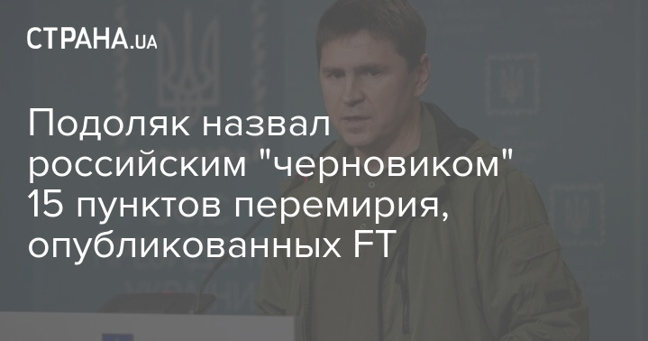 "Кратко. Financial Times опубликовала черновик, демонстрирующий запрос российской стороны. И не больше. У украинской стороны свои позиции. Единственное, что мы подтверждаем на этом этапе – это прекращение огня; вывод русских войск и гарантии безопасности от ряда государств", - заявил Подоляк.