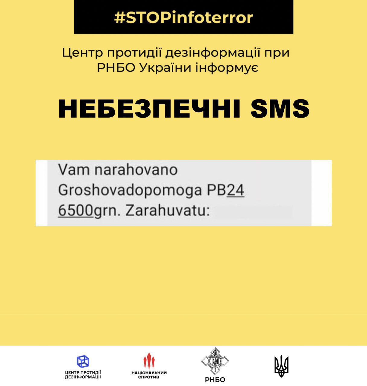 Центр противодействия дезинформации при СНБО предупреждает о новом виде телефонного мошенничества. Если вы получите SMS с текстом "Vam narahovano Groshovadopomoga PB24 6500. Zarahuvatu...", не переходите по ссылке. Есть большой риск взлома телефона.