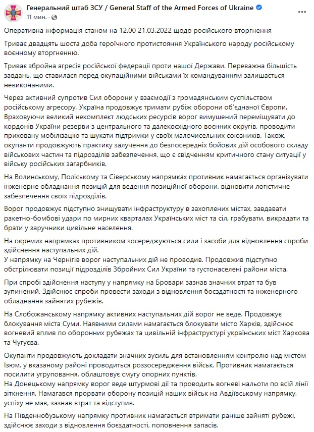 В понедельник днем, 21 марта, Генштаб ВСУ опубликовал новую сводку с фронта. В ней говорится о том, что учитывая большой некомплект человеческих ресурсов, враг вынужден перемещать к границам Украины резервы из центрального и дальневосточного военных округов, проводить скрытую мобилизацию и искать поддержки у своих союзников.