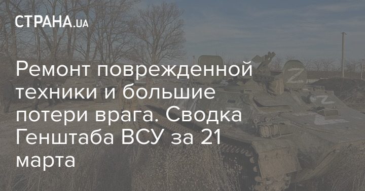 В понедельник вечером, 21 марта, Генштаб ВСУ опубликовал свежую сводку с фронта. В ней говорится, что оккупационные войска, действующие на территории Украины, остро нуждаются в ремонте и восстановлении поврежденного вооружения и военной техники. Также продолжают фиксироваться случаи дезертирства среди личного состава.