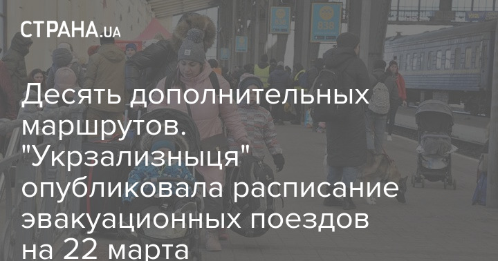 Украинский железнодорожный перевозчик "Укрзализныця" опубликовала график эвакуационных поездов на 22 марта. Это дополнительно назначенные составы. Об этом говорится в сообщении перевозчика на Facebook.