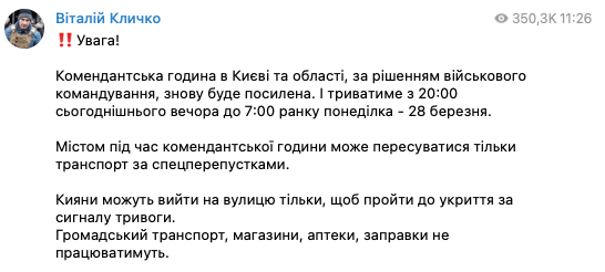 "Комендантский час в Киеве и области по решению военного командования снова усилена и будет продолжаться с 20:00 сегодняшнего вечера до 7:00 утра понедельника – 28 марта", - говорится в сообщении.