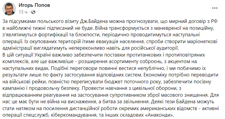 "По итогам польского визита Байдена можно прогнозировать, что мирный договор с РФ в ближайшие недели подписан не будет. Война трансформируется с маневренной на позиционную", - пишет он.