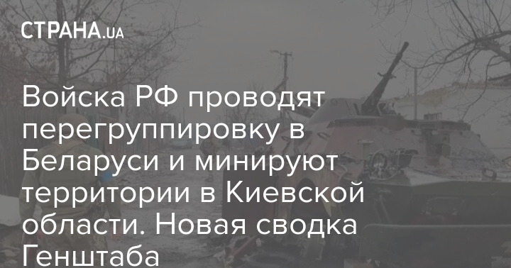 Утром в четверг, 31 марта, Генштаб ВСУ опубликовал свежую сводку с фронта. Сообщается, что в Беларуси фиксируется перегруппировка сил РФ, а в Киевской области замечены случаи минирования территории и зданий.