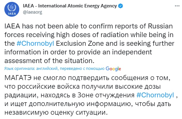 По данным украинской стороны, отмечается на сайте МАГАТЭ, две колонны российских военных были направлены в сторону Белоруссии. Еще одна покинула Славутич, где проживает персонал станции, и также направилась в сторону Белоруссии.