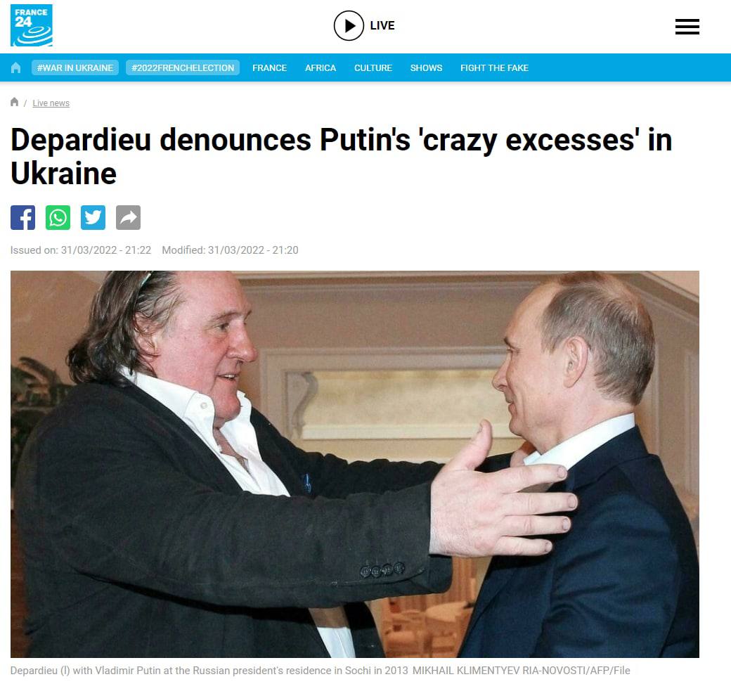 10.16 Актер Жерар Депардье в интервью AFP осудил "безумные, неприемлемые эксцессы" президента России Владимира Путина в Украине, но сказал, что российский народ не несёт за них ответственности.