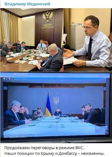 Глава российской делегации Владимир Мединский опубликовал фото со встречи в режиме видеосвязи с украинской делегацией.