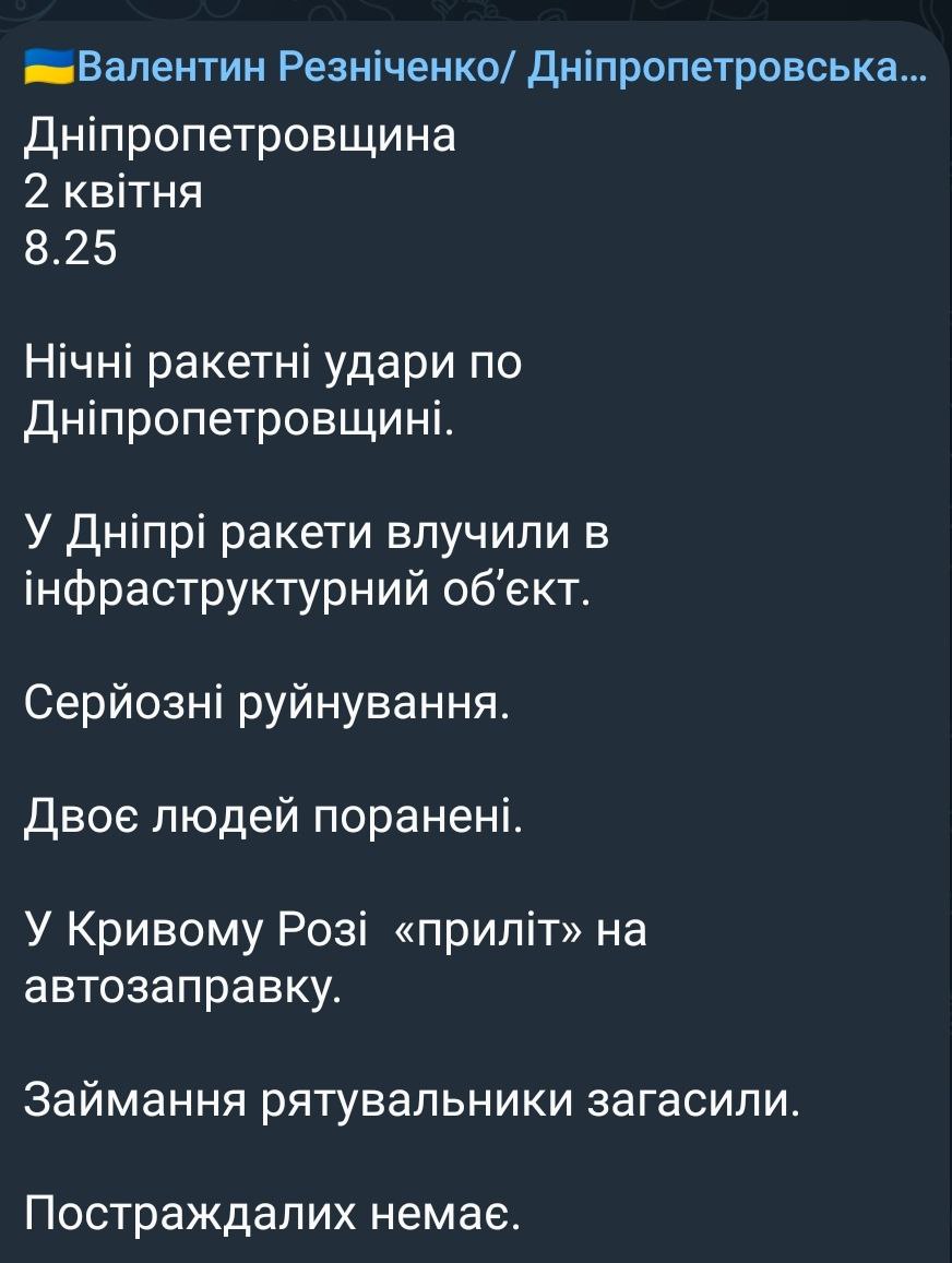 Также ракетные удары сегодня ночью были нанесены и по Днепропетровской области. Как рассказал глава ОВА Валентин Резниченко, удар пришелся по инфраструктурным объектам, нанеся им серьезные разрушения. Два человека получили ранения. Также он уточнил, что в Кривом Роге "прилет" пришелся на автозаправку.