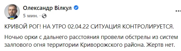 Похожая ситуация и в Кривом Роге. Александр Вилкул рассказал, что ночью россияне обстреляли территории Криворожского района из систем залпового огня. По его словам, обошлось без жертв.