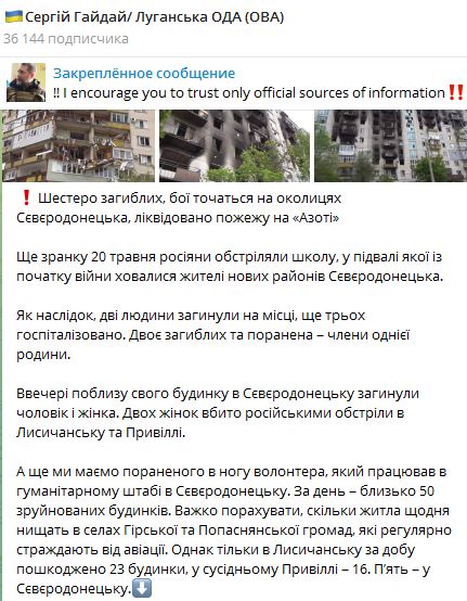 20:57 Продолжаются бои в Рубежном и Попасной, сообщил губернатор Луганской области Сергей Гайдай в вечернем отчете. По его словам, от Горного до Попасной весь участок обстреливается с утра до ночи. Сегодня из этого района вывезено 640 человек.