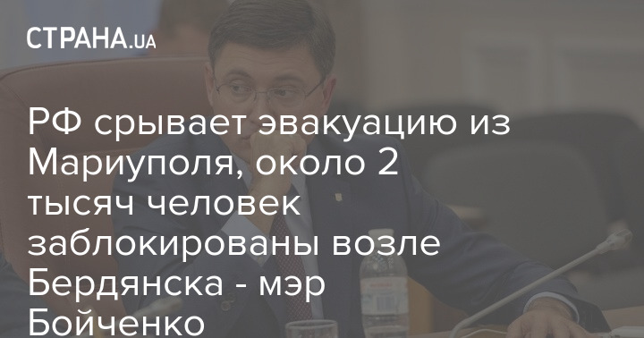 "Мы ждали, что на Луначарском кольце, возле Бердянска, состоится эвакуация. Там сегодня 2 тыс. жителей Мариуполя ждут, которые выехали, добрались до Бердянска. Они уже 2 недели ждут эвакуации, и мы объявили ее начало. Но российские войска разрушают наши планы, не позволяют мариупольцам добраться на подконтрольную Украине территорию Запорожья", - сказал Бойченко.