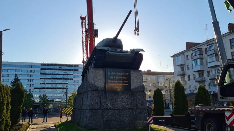 Утром в четверг, 5 мая, в Житомире демонтировали советский танк. Теперь с площади Победы в центре города его переместят к Монументу Вечной славы. Демонтаж планировали на 9 мая, но во избежание скопления людей сделали это раньше.