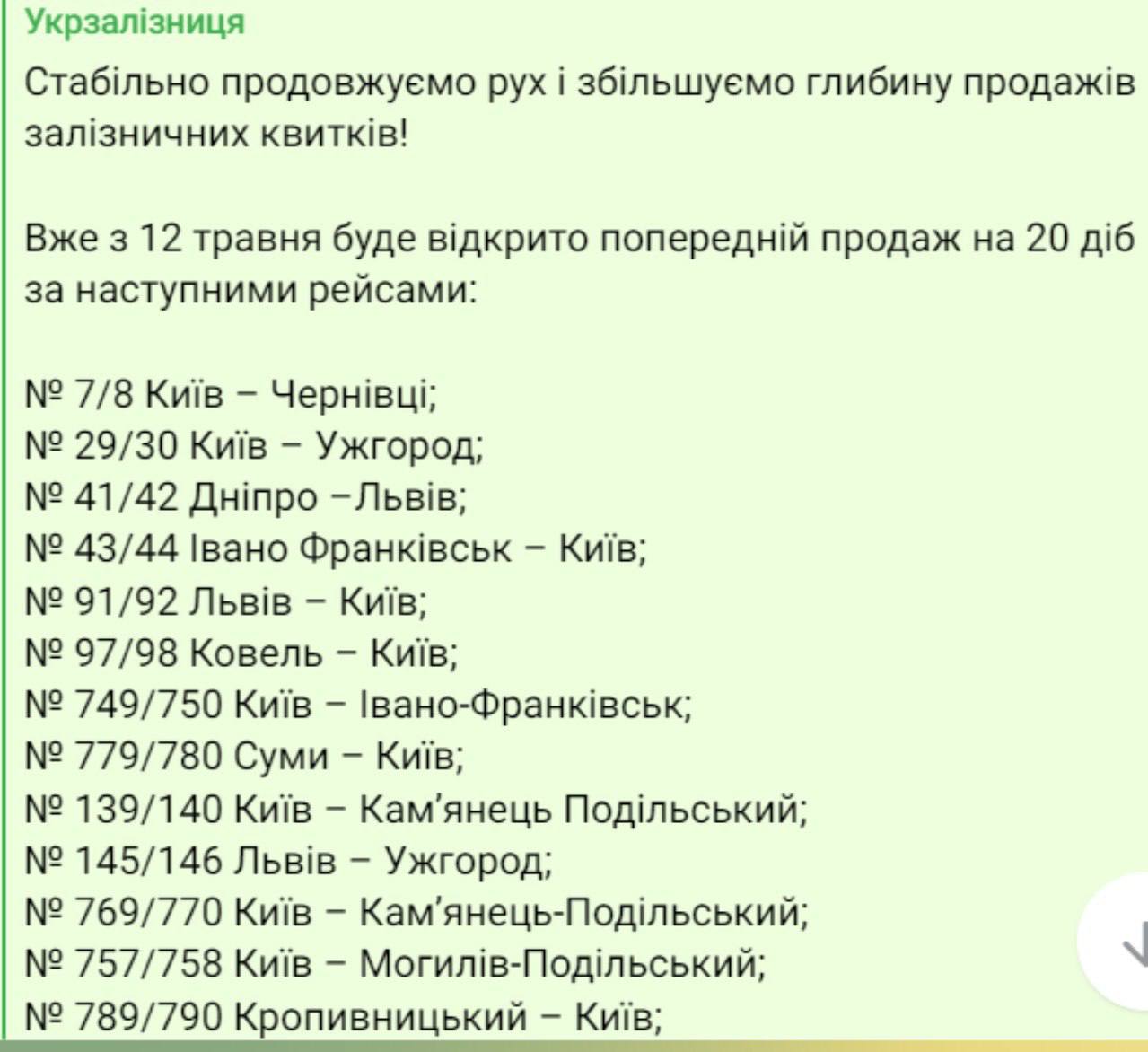 22.54 "Укрзализныця" сообщает о восстановлении 14 маршрутов поездов. Уже с 12 мая будут открыты предварительные продажи на 20 суток по следующим рейсам: