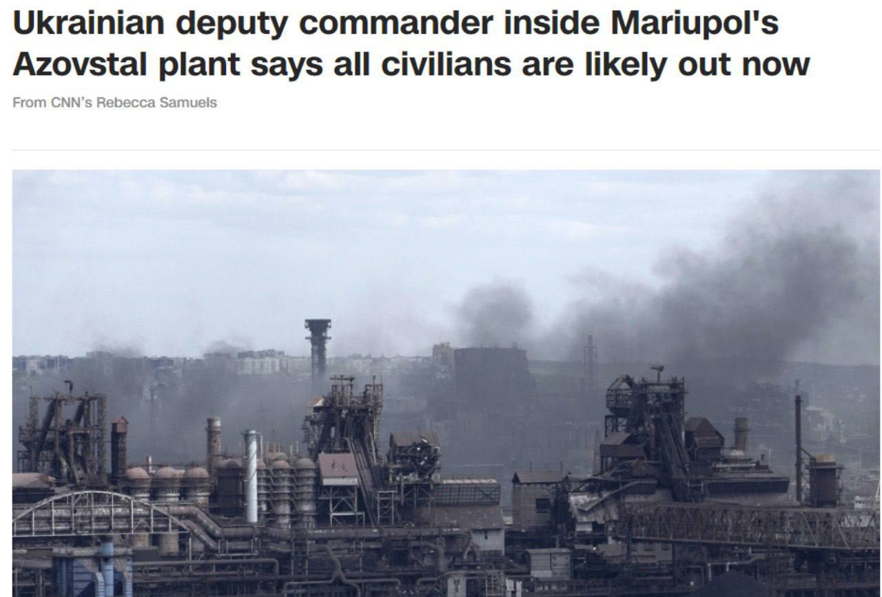 23.31 Все гражданские лица, находившиеся на "Азовстали" вместе с военными, уже эвакуированы. Об этом заявил CNN заместитель командира полка "Азов" Святослав Паламарь.