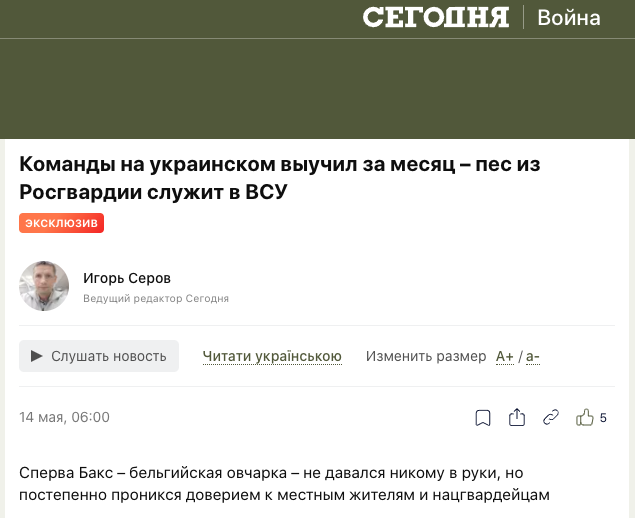 В рядах Нацгвардии служит трофейная бельгийская овчарка Росгвардии. Меньше чем за месяц собака выучила команды на украинском языке.