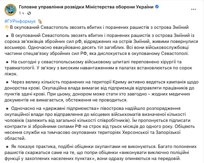 "Из сорока связистов вооруженных сил РФ, откомандированных на остров Змеиный, живыми вернулись восемь. Одновременно эвакуированы десять тел погибших. Все они военнослужащие части спецсвязи вооруженных сил РФ, которая дислоцируется в оккупированном Севастополе", - говорится в сообщении.