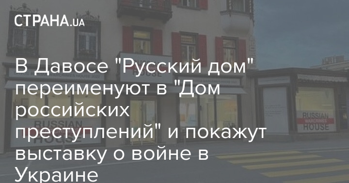 Площадку "Русский дом" (Russian house) в швейцарском Давосе переименуют в "дом российских преступлений" (Russian war crimes house) и там же организуют выставку о войне в Украине. Об этом сообщает "Фонд Виктора Пинчука", который выступил организатором выставки ежегодной встречи Всемирного экономического форума в Давосе наравне с PinchukArtCentre в партнерстве с Офисом президента Украины, Министерством иностранных дел Украины, интернет-изданием Украинская правда и Украинской ассоциацией профессиональных фотографов.
