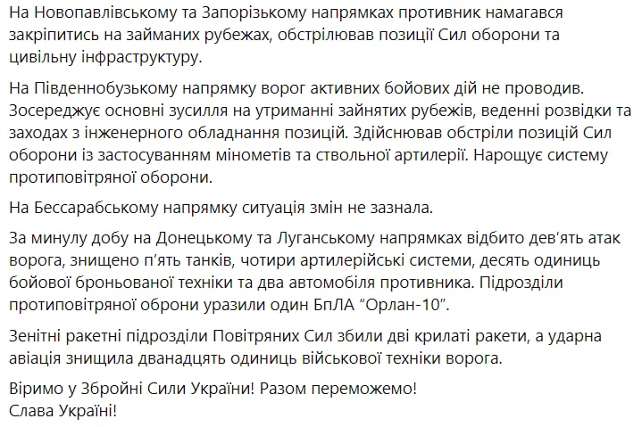- Под Бахмутом враг закрепился в районах Триполья, Липового и Васильевки, пытается улучшить свое положение.