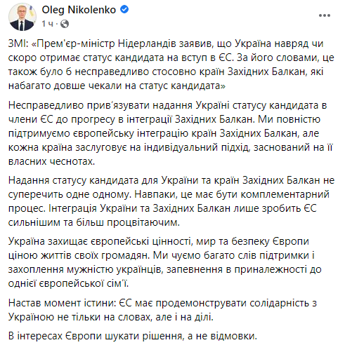 Так ответил спикер МИД Олег Николенко у себя в Facebook на заявление премьера Нидерландов, который не считает, что Украина в ближайшее время не может стать кандидатом на вступление в ЕС.