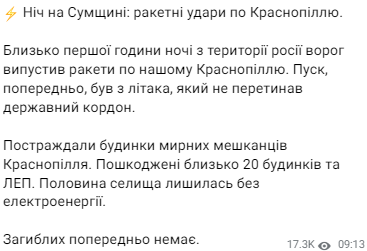 Ночью российские войска нанесли ракетные удары по Краснополью в Сумской области. Повреждены около 20 домов и линии электропередач (ЛЭП). По предварительным данным, жертв среди жителей поселка нет.
