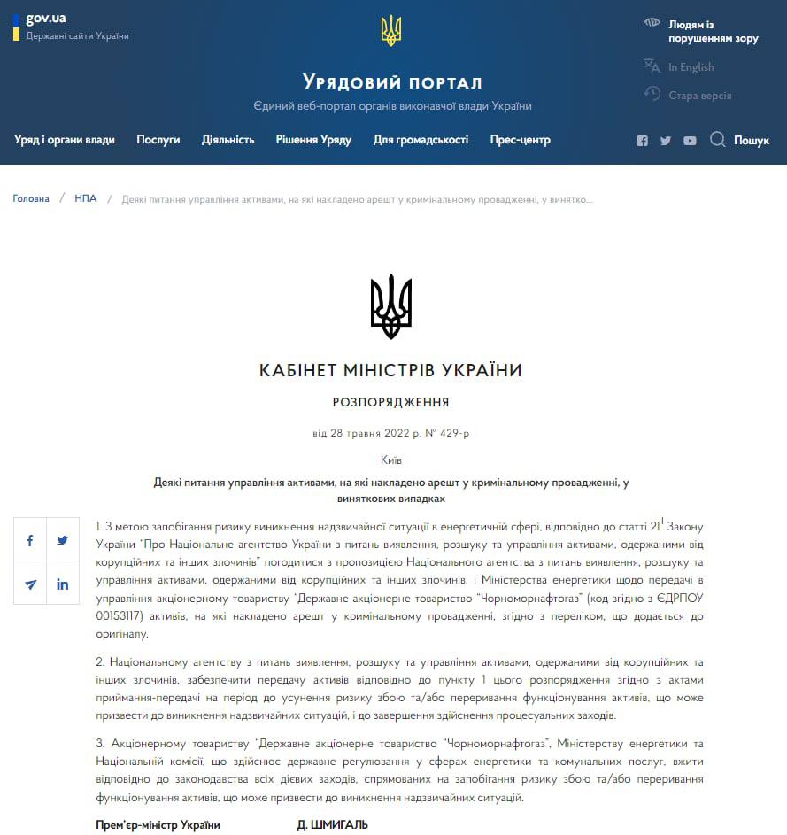 Кабмин распоряжением от 28 мая (№ 429-р) передал госпредприятию "Черноморнефтегаз" (управляется НАК "Нафтогаз Украины") ряд арестованных активов.