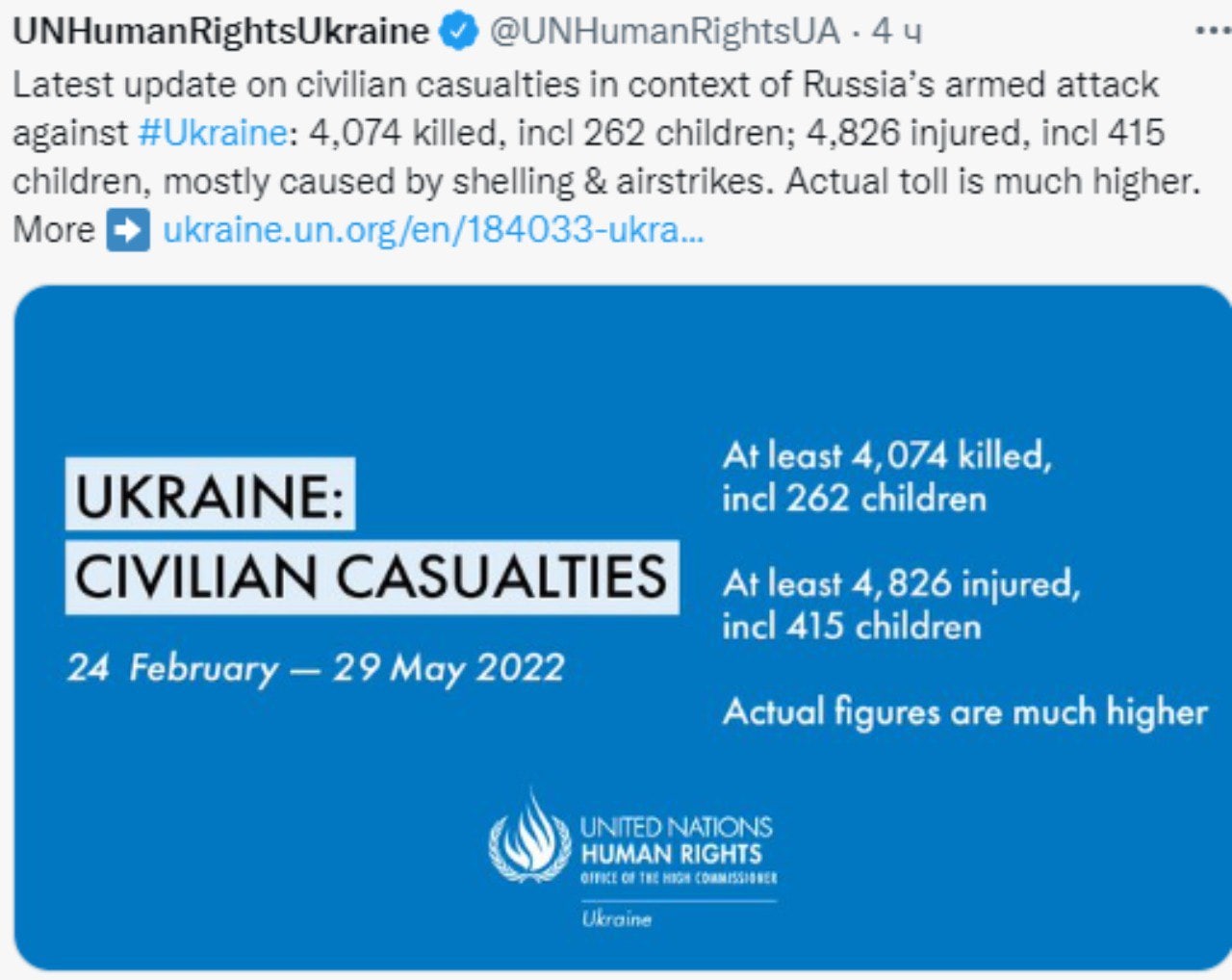 С начала войны в Украине погибли 4 074 мирных жителя, 4 826 граждан получили ранения.