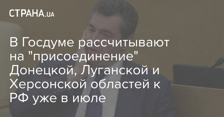 Глава международного комитета Российской Госдумы Леонид Слуцкий рассчитывает на "присоединение" Донецкой, Луганской и Херсонской областей к РФ уже в июле этого года.