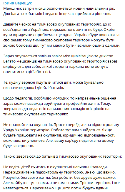 "Что касается педагогов, особенно молодых, то неправильное решение сейчас может навсегда разрушить профессиональную жизнь. Поэтому обращаюсь к педагогам учебных заведений всех уровней на временно оккупированных территориях: Не работайте на оккупантов. Просто переезжайте на подконтрольную правительству Украины территорию. Работа здесь вам найдется", - написала Верещук.