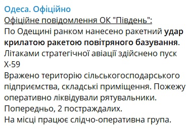 По Одесской области сегодня утром нанесли ракетный удар. Попадание пришлось по сельхозпредприятию,.