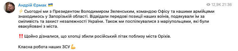 Отметим, что как раз сегодня в Запорожской области с визитом находится Ермак и Владимир Зеленский.
