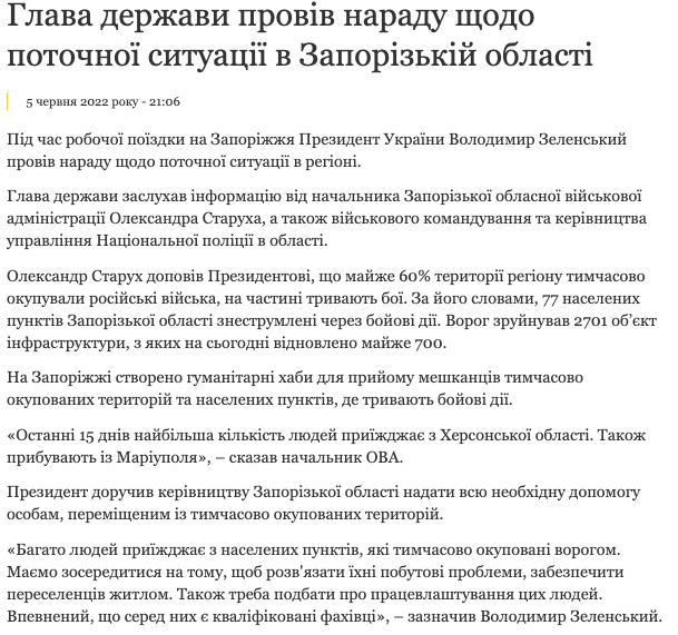 "Губернатор Александр Старух доложил Президенту, что около 60% территории региона временно оккупировали российские войска, на части продолжаются бои", - говорится в сообщении.