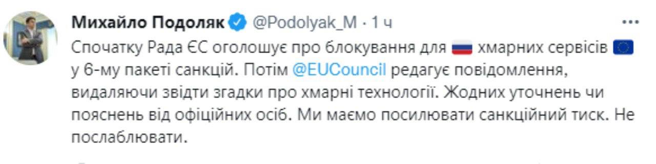 19.28 Совет Евросоюза удалил из своих сообщений упоминание о том, что ЕС вводит для России блокировку европейских облачных сервисов.