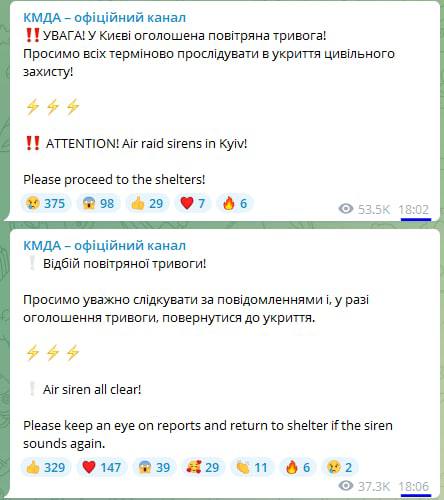 "Внимание! В Киеве объявлена воздушная тревога! Просим всех срочно проследовать в укрытие гражданской защиты", - призывает "КМДА - офіційний канал" в Телеграм.
