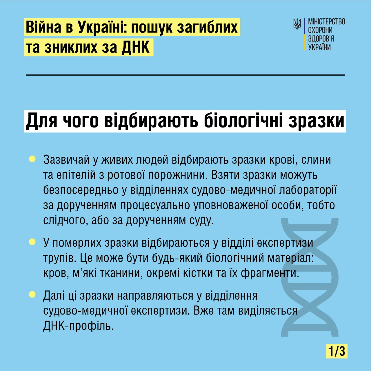 Собирать образцы необходимо для вывода ДНК-профиля и последующего сравнения с имеющимися в единой базе данных. В настоящее время на территории Украины образцы ДНК отбираются у биологических родителей или детей пропавшего человека. Для того чтобы сдать биологические образцы, родственникам нужно иметь с собой паспорт, для ребенка – свидетельство о рождении.