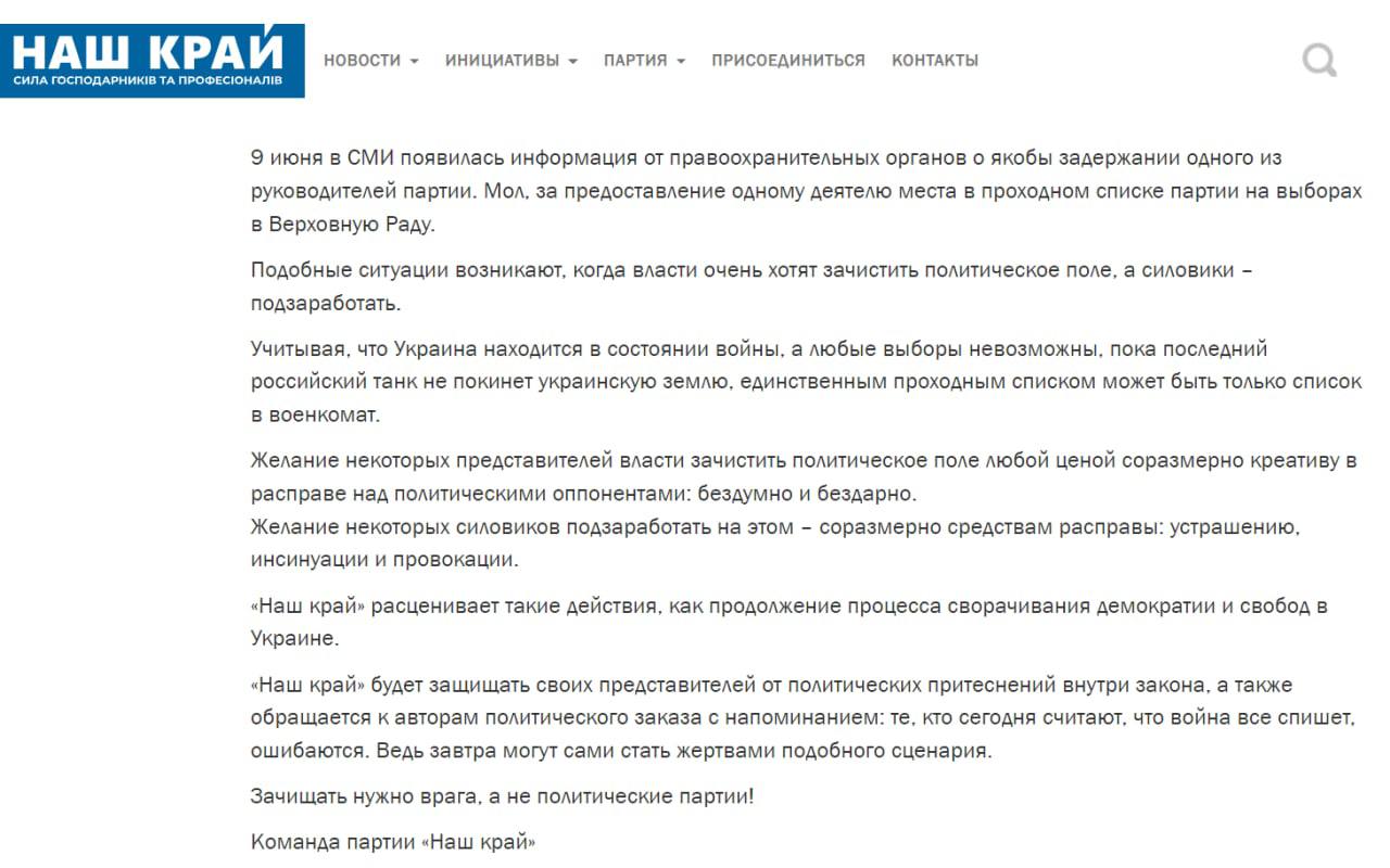 "Наш край" расценивает такие действия как продолжение процесса сворачивания демократии и свобод в Украине", - говорится в заявлении партии.