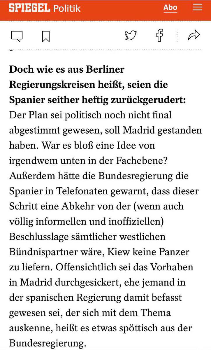 Но, по данным источников издания, испанцы резко отступили: федеральное правительство Германии в телефонных звонках предупредило испанцев, что этот шаг будет отступлением от принятого всеми западными союзниками (хотя и неформального) решения не снабжать Киев танками.