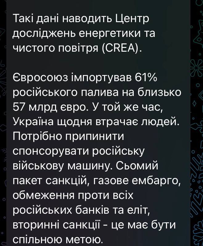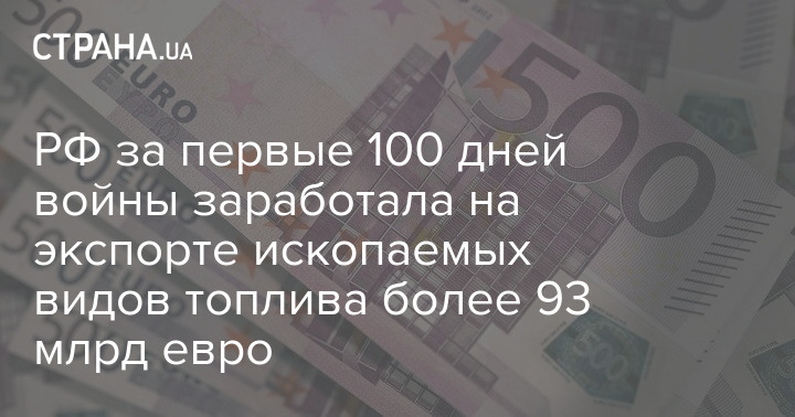 "Россия заработала 93 миллиарда евро дохода от экспорта ископаемого топлива за первые 100 дней после вторжения в Украину. ЕС импортировал 61% этого объема на сумму около 57 миллиардов евро" - говорится в сообщении.