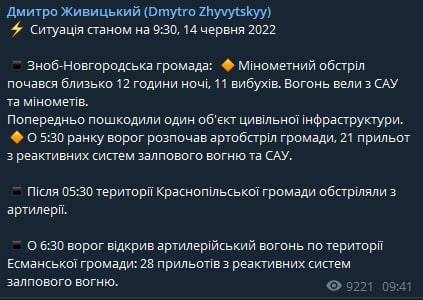В частности, по его данным, ночью 11 взрывов было зафиксировано в Зноб-Новгородской громаде. Огонь вели ночью из САУ и минометов. 21 прилет - из РСЗО и САУ по территории этой громады рано утром.