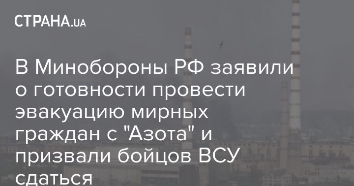 Минобороны России утверждает, что украинская сторона попросила организовать гуманитарный коридор для эвакуации гражданских с завода "Азот" в Северодонецке на подконтрольную Украине территорию в Лисичанск.