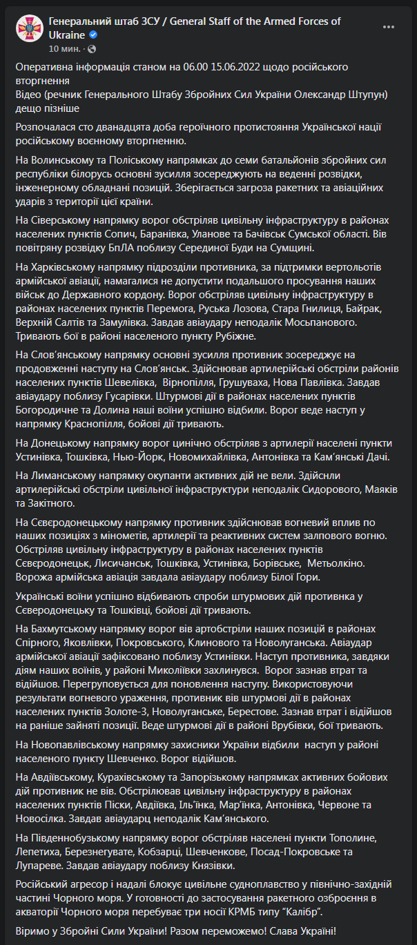 Сводка опубликована на Facebook-странице Генштаба.