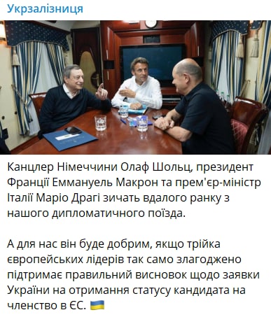 09:33 Советник министра внутренних дел Виктор Андрусив подтвердил в Telegram, что Шольц, Макрон и Драги "везут кандидатство в ЕС".